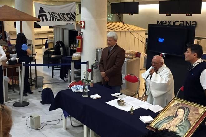 Cd. de México (12 julio 2016).- Ex trabajadores de Mexicana de Aviación conmemoraron 95 años del surgimiento de la empresa en un plantón que instalaron en el Aeropuerto Internacional de la Ciudad de México (AICM) desde hace más de dos años.Los jubilados, que reclaman el pago de sus pensiones tras la quiebra de la empresa, recordaron su aniversario con una misa.